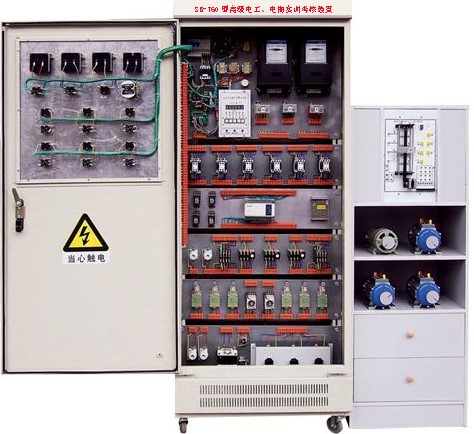 該裝置按標(biāo)準(zhǔn)電氣控制柜設(shè)計(jì)制造規(guī)格,充分利用雙面位置,柜內(nèi)裝有完成各種照明電路所需的單相電度表、日光燈、單聯(lián)開(kāi)關(guān)、插座、感應(yīng)開(kāi)關(guān)、漏電開(kāi)關(guān)等,以及電氣控制所需要的多種低壓電器,如漏電斷路器、熔斷器、電流互感器、交流接觸器、時(shí)間繼電器、熱繼電器、中間繼電器、行程開(kāi)關(guān)、按鈕、信號(hào)燈、轉(zhuǎn)換開(kāi)關(guān)、電壓表、電流表、功率表及電度表等,為了延長(zhǎng)電器使用壽命,各電器的接點(diǎn)都與接線端子相連,再由接線端子與被控制電氣連接。