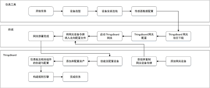 模擬智慧牧場(chǎng)系統(tǒng)還引入使用開(kāi)源軟件平臺(tái)ChirpStack與ThingsBoard,結(jié)合LPWAN技術(shù),實(shí)現(xiàn)遠(yuǎn)程低功耗數(shù)據(jù)采集、上報(bào)和展示。在ChirpStack平臺(tái)上,用戶(hù)可對(duì)網(wǎng)關(guān)、GPS、溫濕度傳感器等設(shè)備進(jìn)行配置,以上送仿真實(shí)驗(yàn)中的虛擬數(shù)據(jù)。在ThingsBoard平臺(tái)上,設(shè)置牧場(chǎng)地圖、告警信息、溫濕度等各儀表盤(pán)組件;獲取仿真設(shè)備上送的數(shù)據(jù),并將數(shù)據(jù)以圖表形式作可視化呈現(xiàn);以及基于流式編程添加相應(yīng)的規(guī)則策略,最終完成模擬智慧牧場(chǎng)實(shí)訓(xùn)場(chǎng)景的部署搭建。