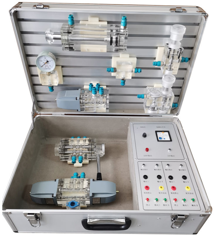 3、箱子集元件元件、液壓泵站、調(diào)速電機及電氣控制部分為一體箱,教師可方便的將設(shè)備帶入課堂進行現(xiàn)場演示教學(xué)和實物講解。