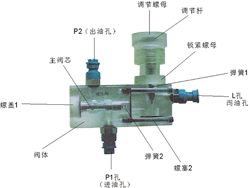 2、溢流閥結(jié)構(gòu)上參考了國產(chǎn)P-63B型低壓直動式溢流閥,其閥體閥蓋、鎖緊螺母、調(diào)節(jié)螺母、螺塞等采用了進口透明有機玻璃材料精制而成,閥芯、調(diào)節(jié)桿采用了45#中碳鋼材料。并配合彈簧,油接頭,密封圈等標(biāo)準(zhǔn)件裝配而成,通過它可明確地觀察到閥芯、彈簧、油孔等結(jié)構(gòu)及其運行過程,具有形象逼真,性能可靠等優(yōu)點。它即可作為教學(xué)模型,也可以作為液壓實驗元件進行實驗演示。
