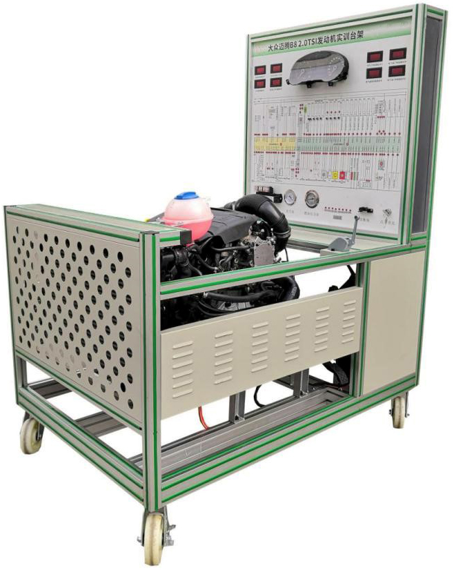該設(shè)備采用翻新新一代邁騰B8 2.0T 電控汽油發(fā)動機總成及運行附件的固定臺架和運行檢測控制面板臺架兩部分組成。