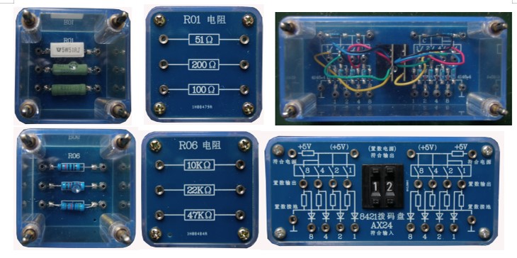 (具體可見(jiàn)表二)提供電工電子透明實(shí)訓(xùn)模塊,可以完成直流電路、模擬電子技術(shù)、數(shù)字電子技術(shù)和電子綜合應(yīng)用實(shí)訓(xùn)項(xiàng)目。實(shí)訓(xùn)模塊面板采用PCB板制作而成,器件和信號(hào)接口均已引至板上的專用插座,實(shí)訓(xùn)模塊有四個(gè)彈性插腳,與專用實(shí)訓(xùn)孔板配套使用。