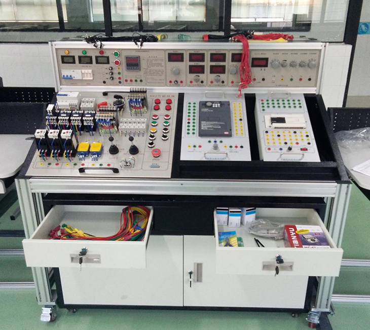 2、合理結(jié)構(gòu):設(shè)備以標(biāo)準(zhǔn)的配電柜為主柜,利用柜體的雙面空間,科學(xué)地布置電器及配套實(shí)驗(yàn)器材。該柜設(shè)計(jì)合理,實(shí)操方便,一柜多用,所有電器元件接點(diǎn)都已接到接線端子上,學(xué)生只需在接線端子上接線實(shí)驗(yàn),延長了電器元件使用壽命、降低了材料損耗。