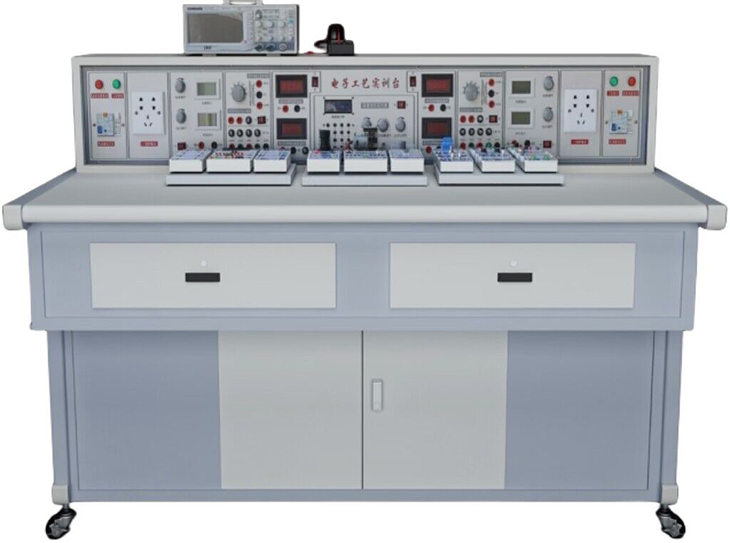 實訓(xùn)桌為鐵質(zhì)雙層亞光密紋噴塑結(jié)構(gòu),桌面為防火、防水、耐磨高密度板,結(jié)構(gòu)堅固。實訓(xùn)桌下方設(shè)有柜子,可以放置實訓(xùn)模塊和工具以及資料等,還設(shè)有四個帶剎車的輪子,便于移動和固定。